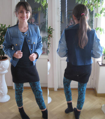 Nästa "lappdress" blev en jeansjacka till yngsta barnbarnet. Jag har länge funderat på vad jag ska göra av alla jeans som krymper. Några har jag gett bort men några omoderna fanns kvar. Barnbarnet ville ha en jeansjacka, men inte en sådan där som alla har sa hon när vi var i affären och letade.