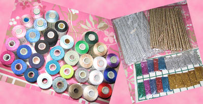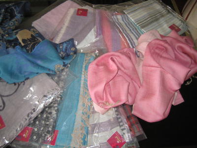 Brodyrtråd, guld- och silverband med mycket glitterstenar på och ett par underbara sjalar i linne och kashmirull. Hon hade flera stycken med sig och så när jag valt "mina" så behöll jag resten också och ska sälja dem åt henne. De är bara helt underbara.