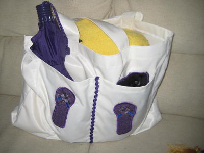 Under denna regnperiod har jag sytt lite kläder till mig själv och börjat på bröllopsklännngen till min väninna och bruden har frågat om jag kan sy en "dagenefterklänning" till henne och det kan man ju inte säga nej till. Gubben har fått några byxor upplagda och det har också blivit lite nytt till köket, en löpare och ett par grytlappar. I söndags blev det en sommarkasse i vit bävernylon som jag får plats med både paraply och regnkläder i.